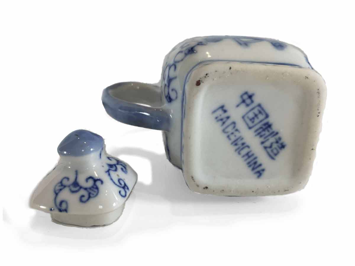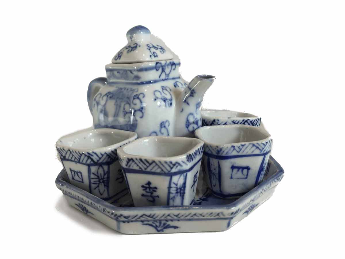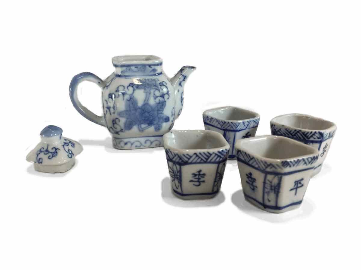 This miniature tea set is 4″ high and 4.75″ wide. It weighs slightly less than .75 lb. It is in excellent condition. There are Chinese characters on the cups. This won’t be around for long. Don’t wait!!