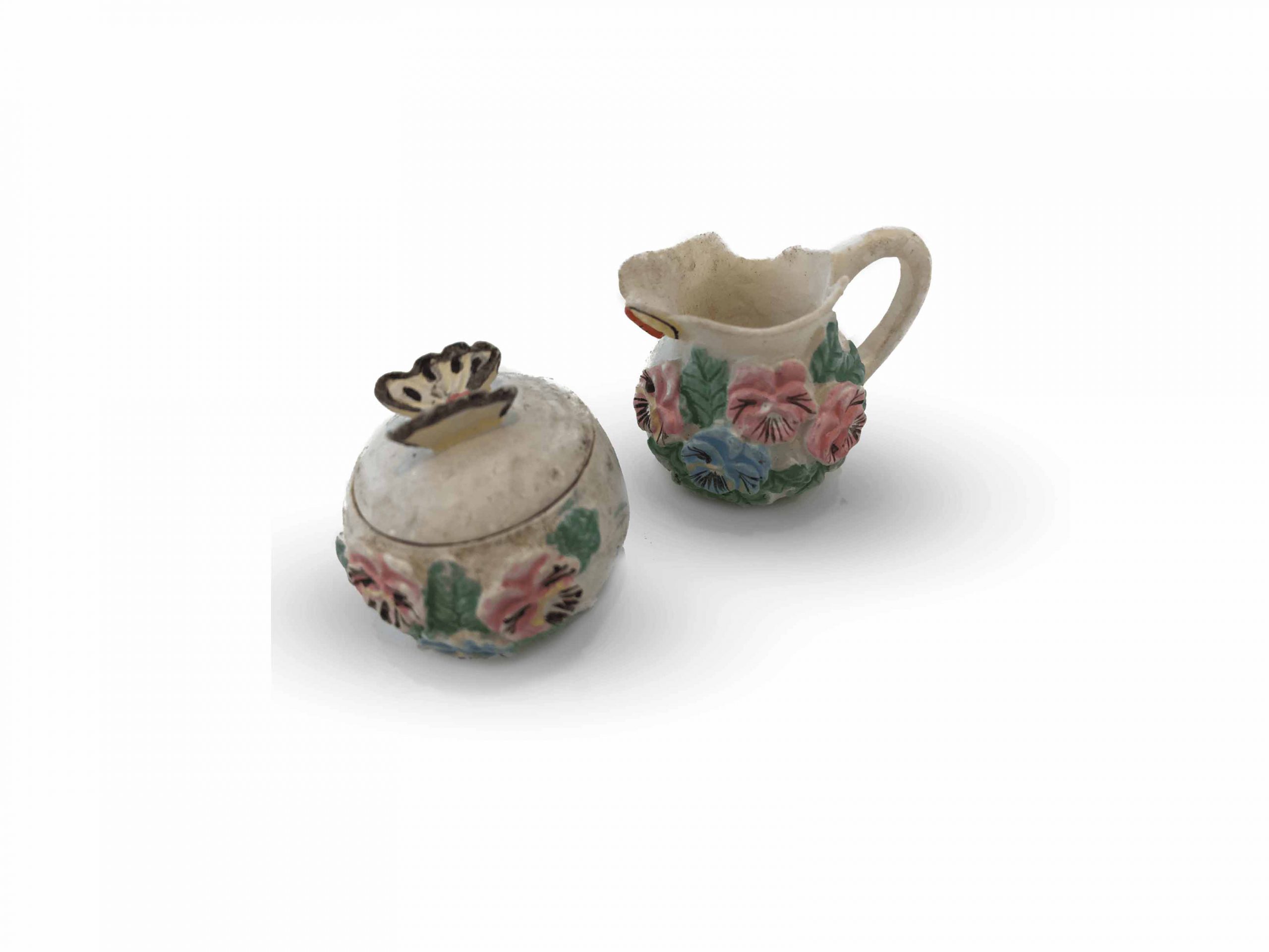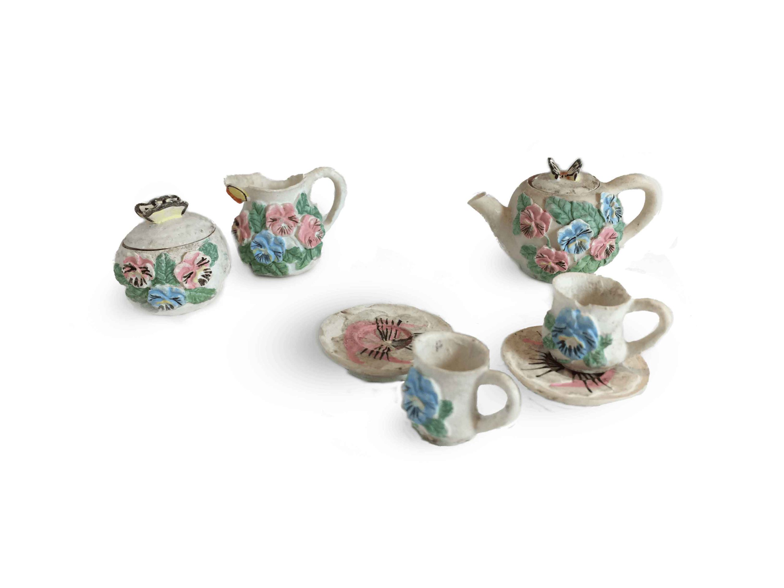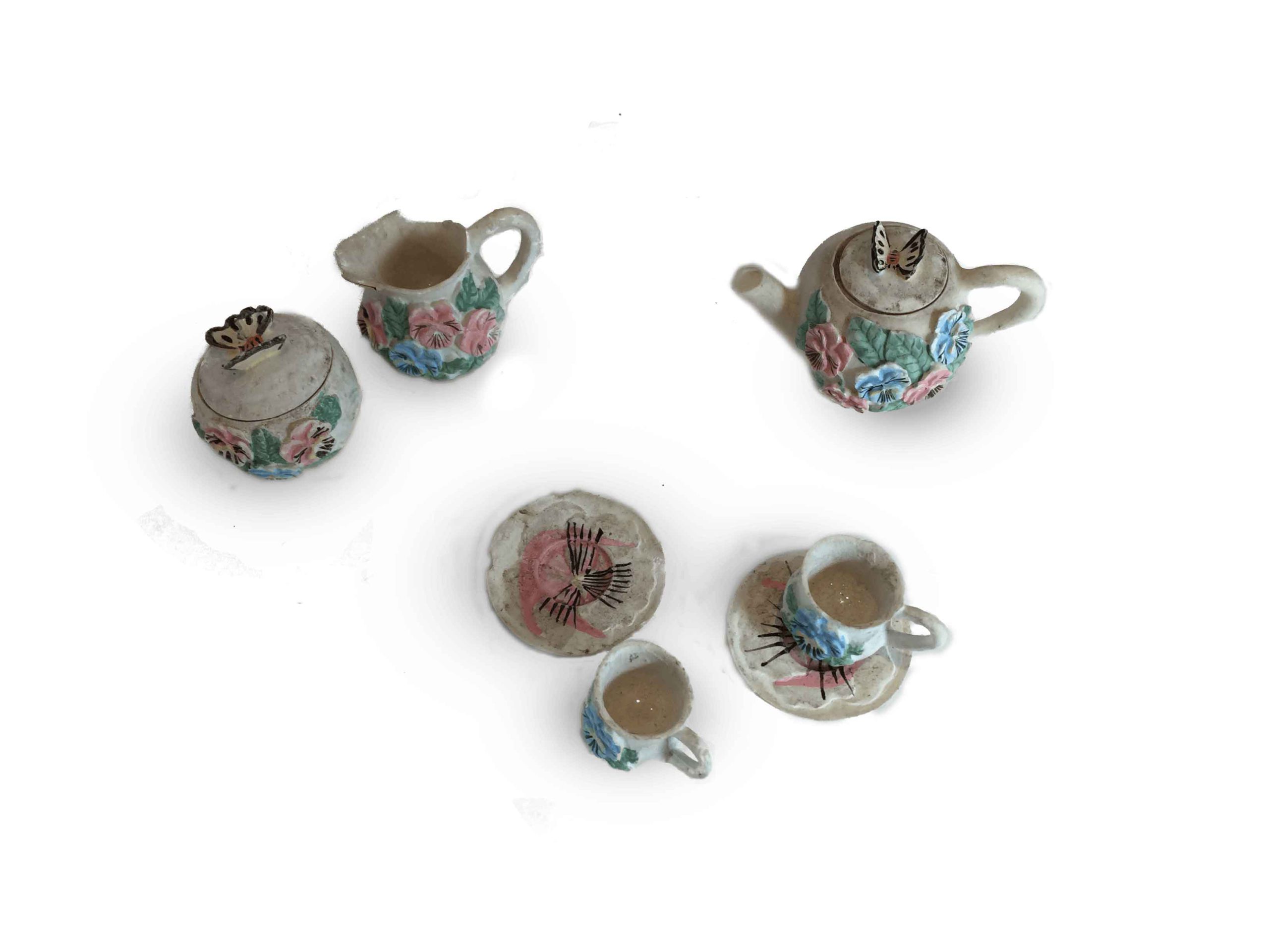 Super cute!! Miniature Tea Set. It is vintage inspired. A real collector’s item. The set includes: raised floral design, creamer, sugar, teapot and, 2 cups, 2 saucers.