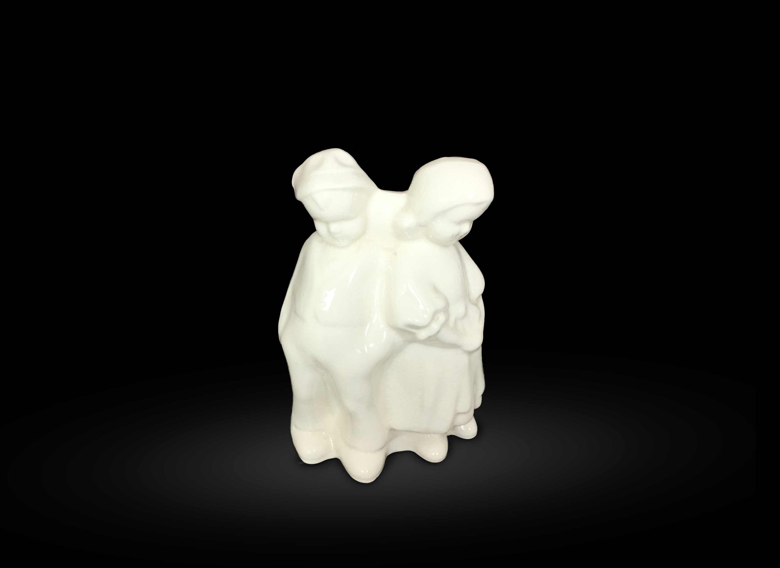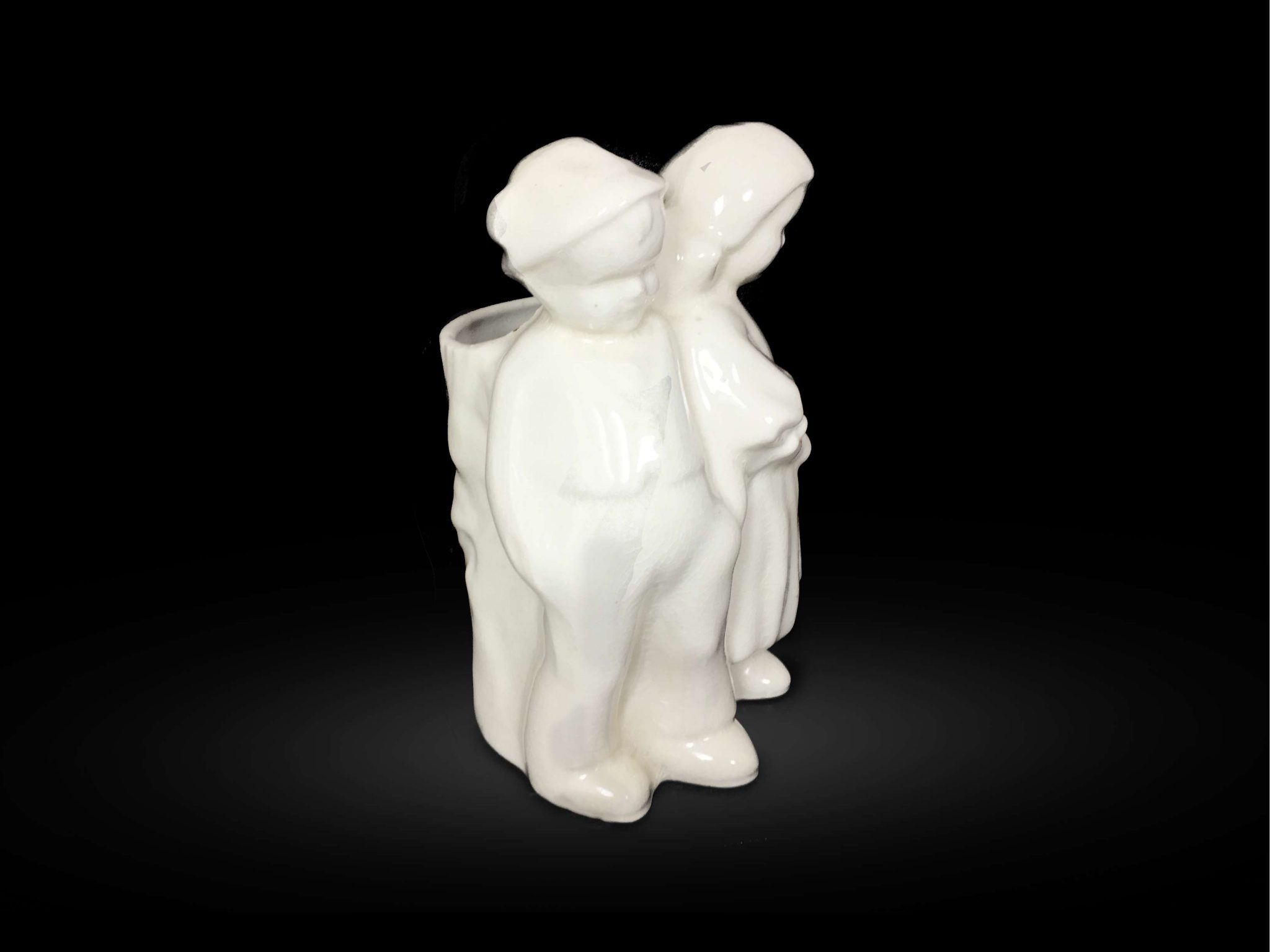 This vase is a cute idea. It make an excellent accent piece. This is believed to be a German Boy and Girl. Due to the low height, even with an additional 5″ of flowers above the figures, it would make an excellent center piece for the table. This vintage inspired piece is thought to be around 70-80 years old and may have come from Germany or Italy. So it is thought to be produced circa 1937. This could also be used as a planter. Excellent condition.